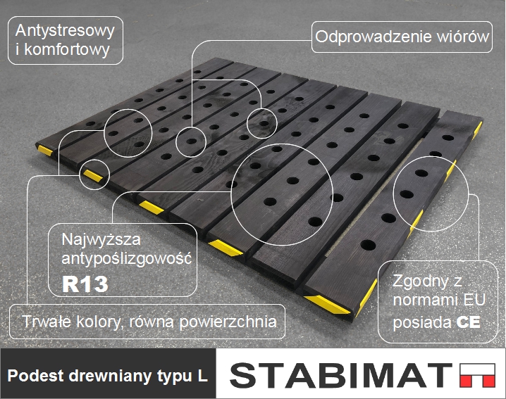 Podesty podłogowe drewniane STABIMAT typu "L" mają zastosowanie w zakładach przemysłowych, jako podesty stanowiskowe do obrabiarek i innych stanowisk roboczych.